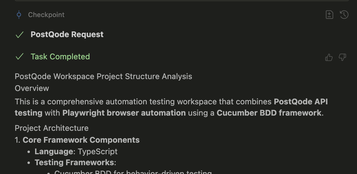 For example, if you're working on a feature and PostQode makes multiple file changes, each change creates a checkpoint. This means you can review each modification and, if needed, roll back to any point without affecting your main Git repository.